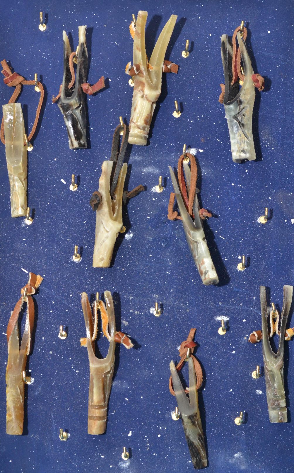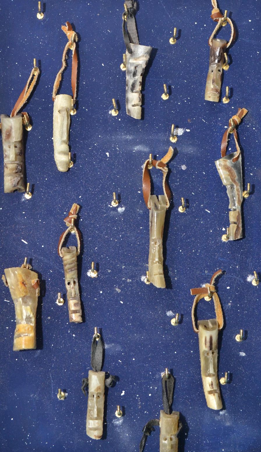 Maschere in corno di montone raffiguranti le varie maschere della tradizione sarda.